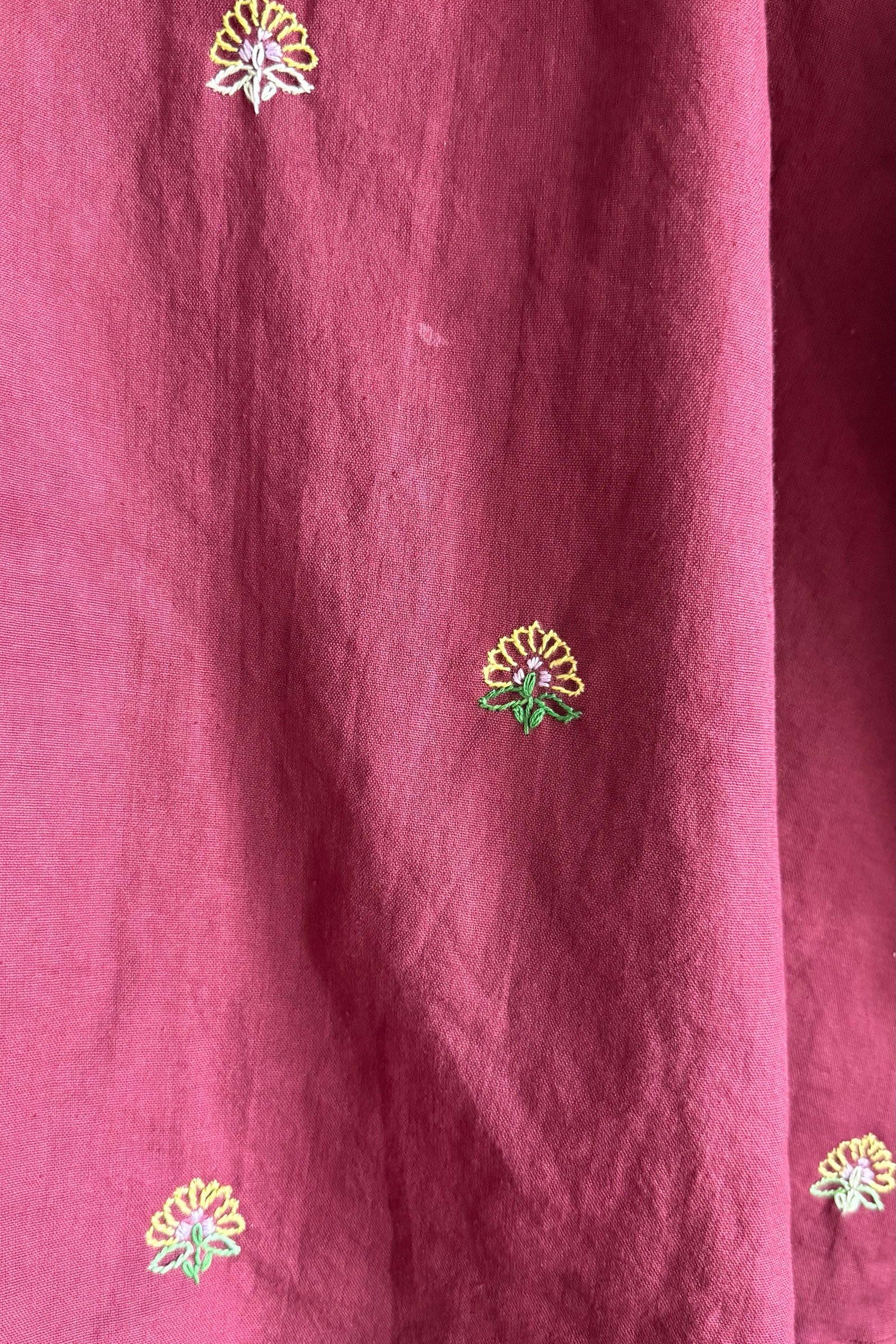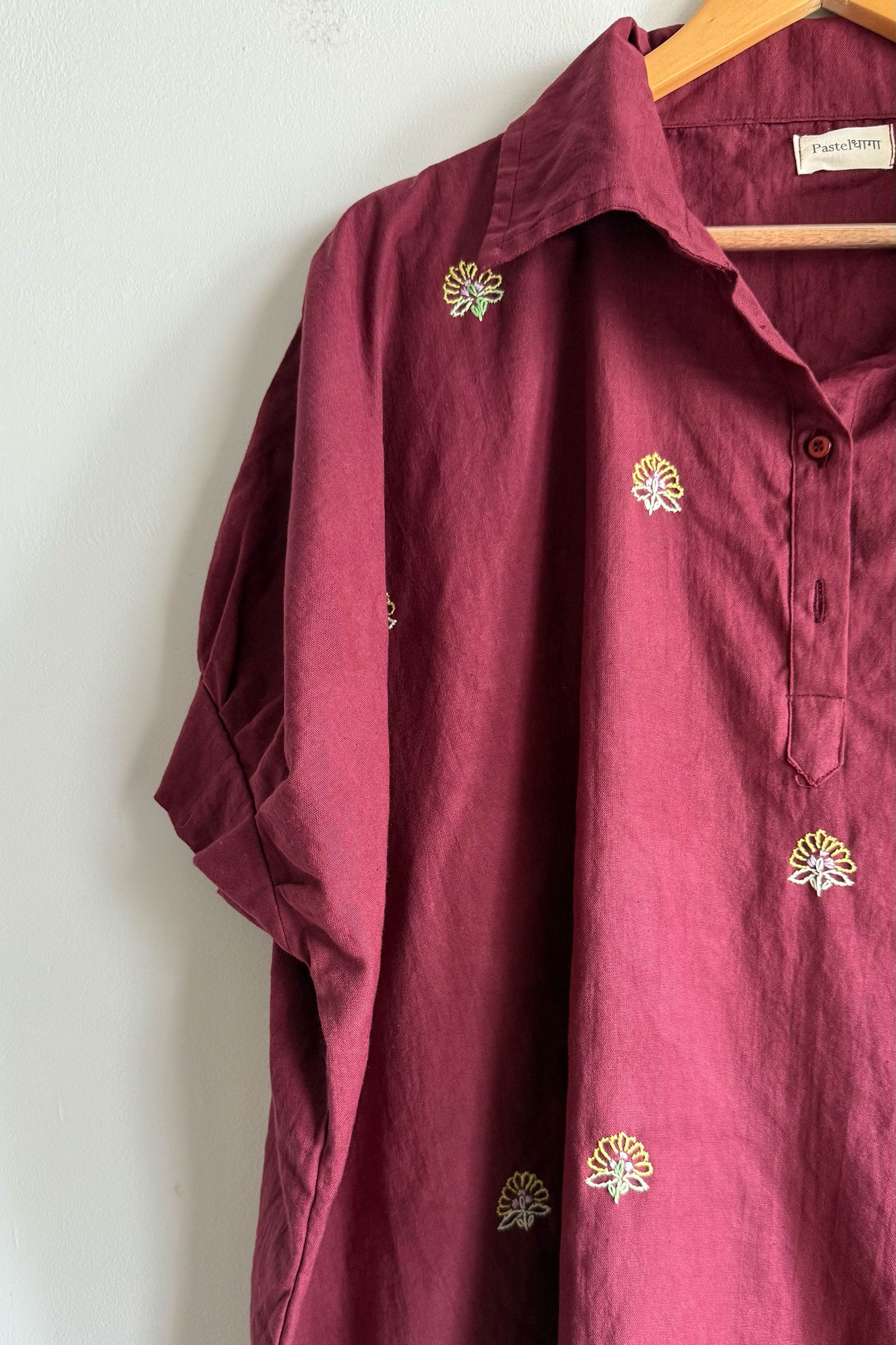 Immerse yourself in the richness of quiet luxury with the Wine Whisper Anti Fit Top β a deep burgundy canvas adorned with delicate hand-embroidered motifs that bloom softly across its surface. The intricate threadwork adds a gentle rhythm to the fabric, evoking the calm grace of evening blossoms swaying in twilight.